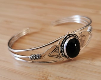 Solid Silver Moroccan Engraved Bracelet with Black Stone